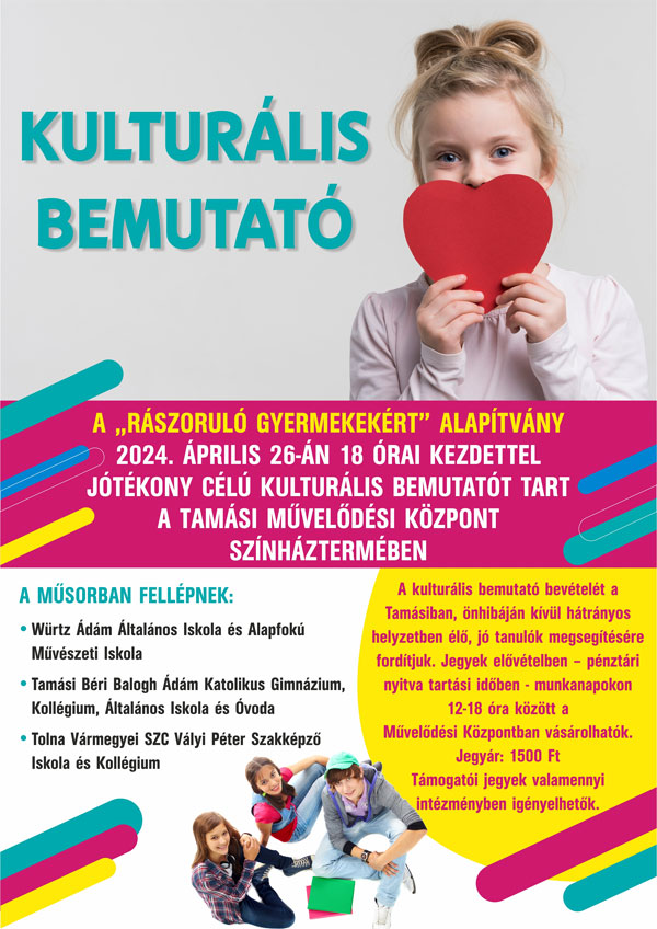 A „Rászoruló Gyermekekért” Alapítvány 2024. április 26-án 18 órai kezdettel jótékony célú kulturális bemutatót tart a Tamási Művelődési Központ színháztermében.