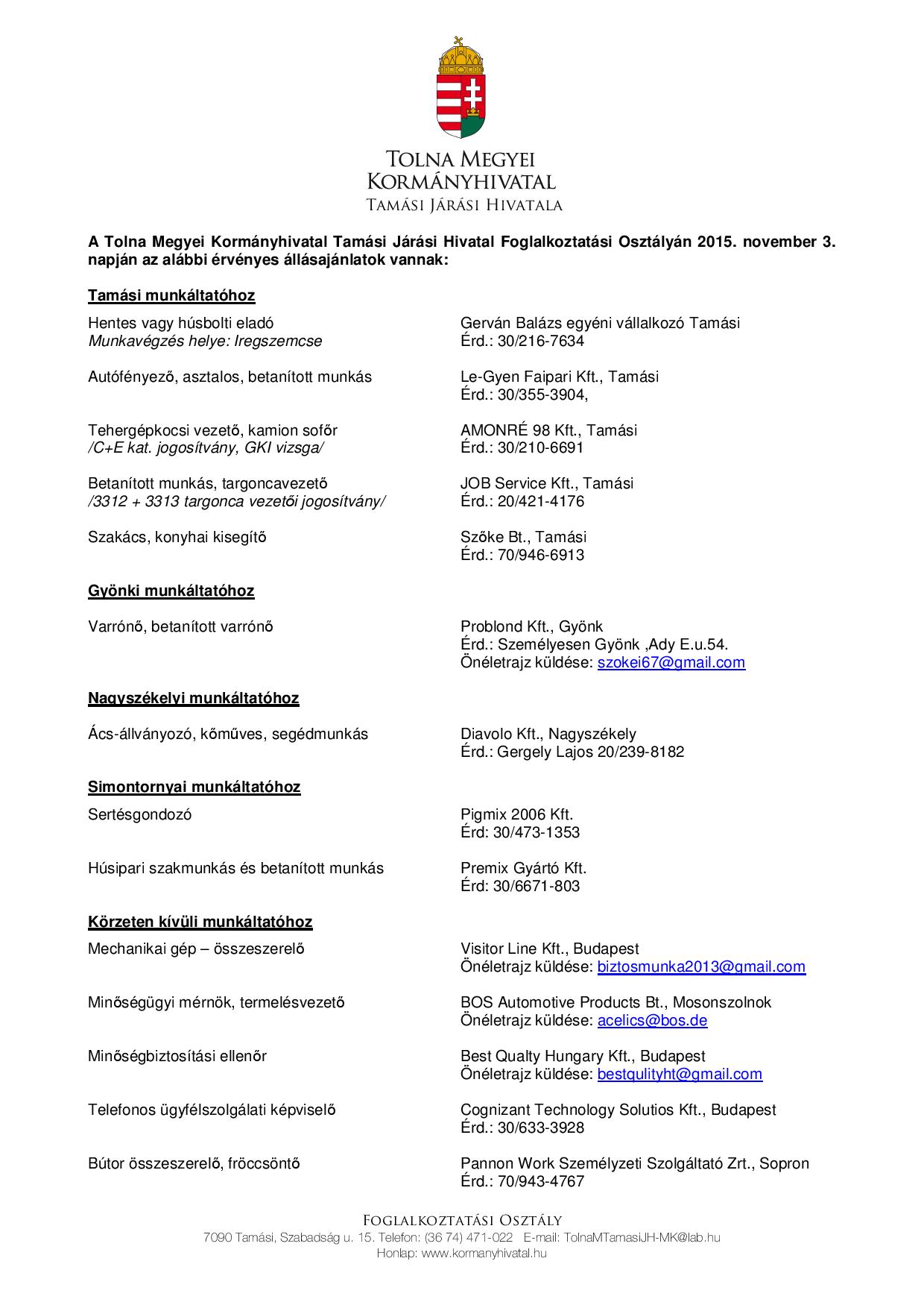 A Tolna Megyei Kormányhivatal Tamási Járási Hivatal Foglalkoztatási Osztályán jelenleg az alábbi érvényes állásajánlatok vannak: