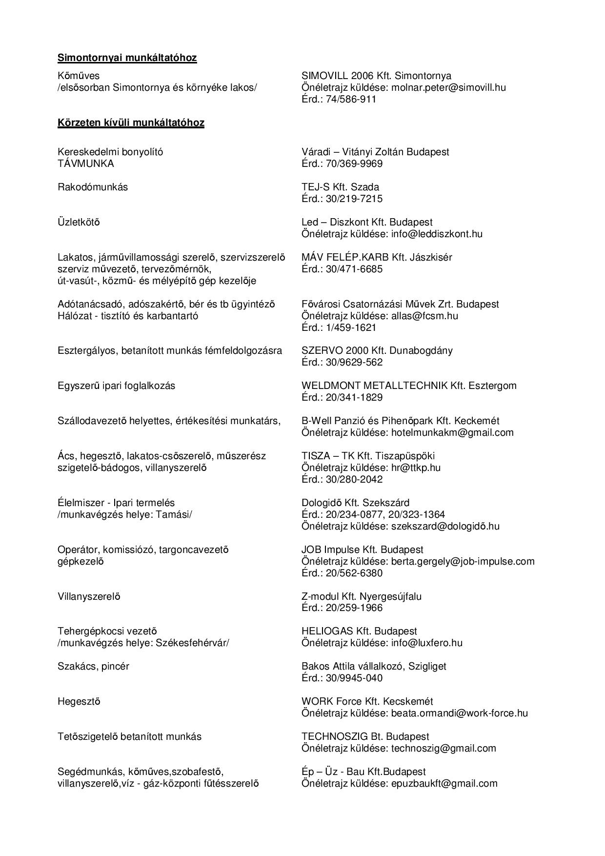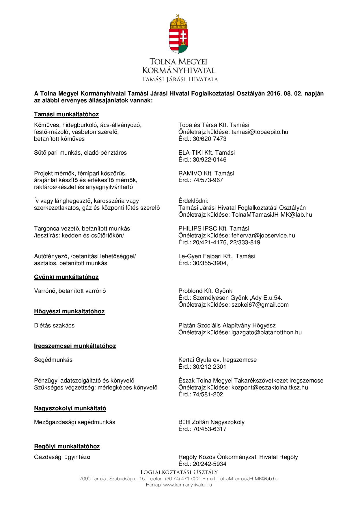 A Tolna Megyei Kormányhivatal Tamási Járási Hivatal Foglalkoztatási Osztályán jelenleg az alábbi érvényes állásajánlatok vannak: