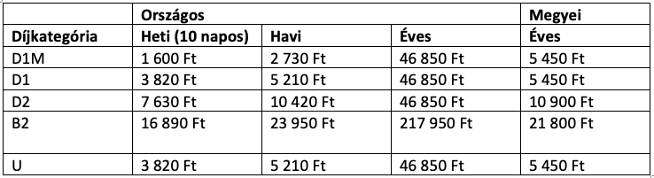 Az online megvásárolható, úgynevezett e-matricák mindenben megegyeznek a papíralapú társaikkal, így áruk is azonos. 2022-ben − a 45/2020. (XI. 28.) ITM rendeletben foglaltak szerint − a bruttó, vagyis általános forgalmiadót már tartalmazó árak a következőképpen alakulnak.