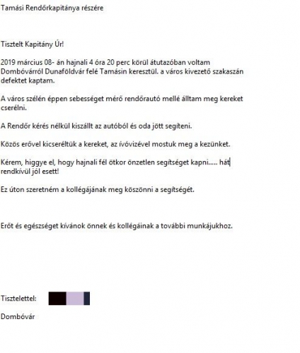 A bajba jutott állampolgár a napokban köszönőlevelet küldött a Tamási Rendőrkapitányság vezetőjének, melyben köszönetét fejezte ki a kolléga önzetlen viselkedéséért.