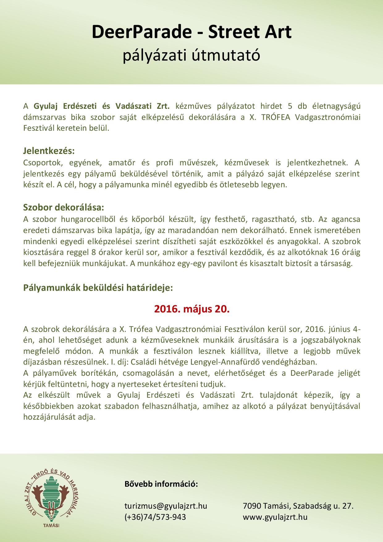 A pályaműveket 2016. május 20-ig kell eljuttatni a Gyulaj Zrt. Tamási, Szabadság u. 27. címére. A legötletesebb pályaművek elkészítői közül kerül ki az, aki a szobrok egyikén, 2016. június 4-én a X. TRÓFEA Fesztiválon elkészítheti elképzeléseit.