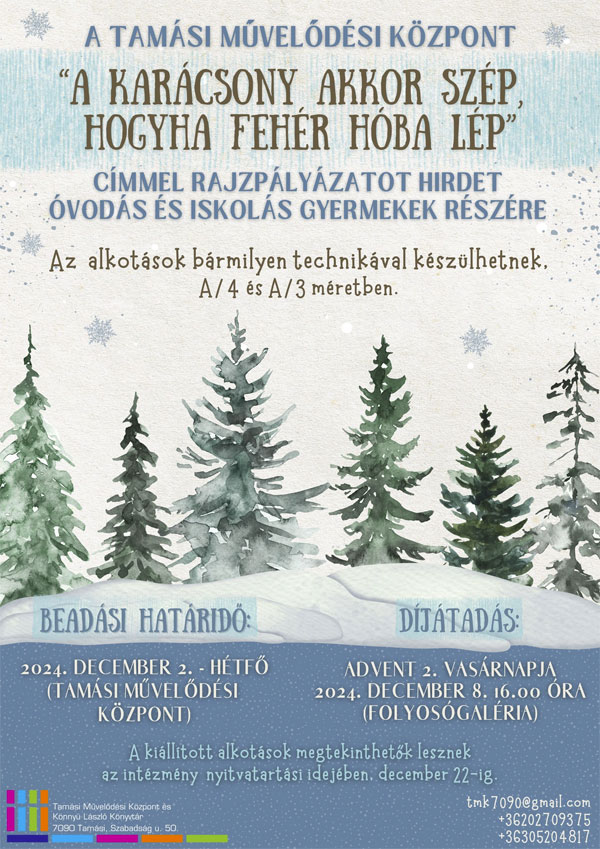 A Tamási Művelődési Központ rajzpályázatot hirdet óvodás és iskolás gyermekek részére, „A karácsony akkor szép, hogyha fehér hóba lép” címmel.