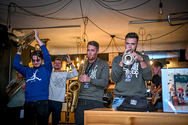 A Smooth Brass zenakar tagjai: Babodi Máté – dobfelszerelés, Bánfai Balázs – elektromos gitár, Kaluczky Zoltán – tuba/helikon, Tulézi Zalán - eufónium, Szarvas Dániel - harsona, Bíró Dávid - kürt, Gasparics Viktor - szaxofon, Pallos Marcell - trombita. (fotó: Pallos Gréta, Takács Csaba)