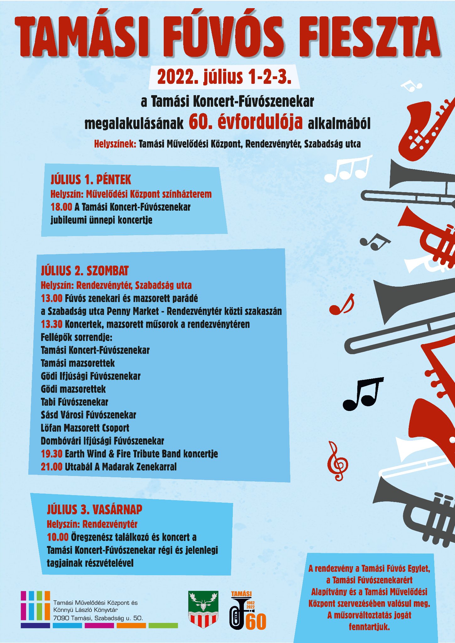 1962-ben, vagyis 60 évvel ezelőtt alakult meg Tamásiban az úttörőzenekar. Az együttes nem csak az akkori nagyközség fontos eseményeinek állandó résztvevője volt, hanem a megye és az ország számos pontján léptek fel és értek el szép sikereket, eredményeket. Határainkon túl is megismerhette őket a közönség, Lengyelországban és az akkori NDK területén is sikerrel szerepeltek. A több évtizedes, számos elismeréssel tarkított működést követően, Hemerle János karmester nyugdíjba vonulása után a zenekar megszűnt. A régi tagok, az addigra már fiatal-felnőtt zenészek kezdeményezésére azonban nem maradt sokáig zenekar nélkül Tamási. A régi muzsikusok összefogásának eredményeként, Lukács Tibor vezetésével, megalakult a felnőtt zenekar. 1988-tól aztán Markovics Gábor került a zenekar élére, munkája eredményeként pedig új lendületet kapott az együttes fejlődése. Országhatáron belüli és azon túli ismertségük folyamatosan nőtt. Közel ezer hazai fellépés, Berlintől Moszkváig közel 20 külföldi turné, nemzetközi versenydíjak, CD és DVD felvételek, elismerések, díjak sora jellemezte ezt a korszakot. Művészeti munkájuk eredményeként 2003-ban kiérdemelték a Babits Mihály-díjat, 2013-ban a Csokonai Vitéz Mihály-díjat, 2015-ben a "Tolna Megyéért-díjat. Markovics Gábort Elek Péter, a sásdi fúvószenekar karmestere követte a zenekar élén, tőle pedig Varga Balázs vette át a karmesteri pálcát, aki 2019 év elejétől vezényli, irányítja a Tamási Koncert-Fúvószenekart. Legutóbb a Színek-Zenék-Zamatok városi rendezvényen léptek fel és adtak tanúbizonyságot arról, hogy a zenekar ismét kiváló formában van. Erről megbizonyosodhat mindenki július első hétvégéjén, ha ellátogatnak a Fúvós Fiesztára. A tamási fúvósok mellett még több zenekar, mazsorett csoportok gondoskodnak a kiváló színvonalról és hangulatról a tamási rendezvénytéren.