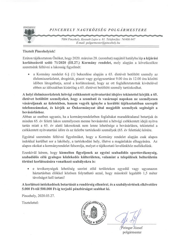 Piringer József polgármester arra kéri a 65 év felettieket, hogy hétvégén a boltok csökkentett nyitvatartási idejére tekintettel ne személyesen vásároljanak be, kérjék erre az önkormányzat által megjelölt segítőket.