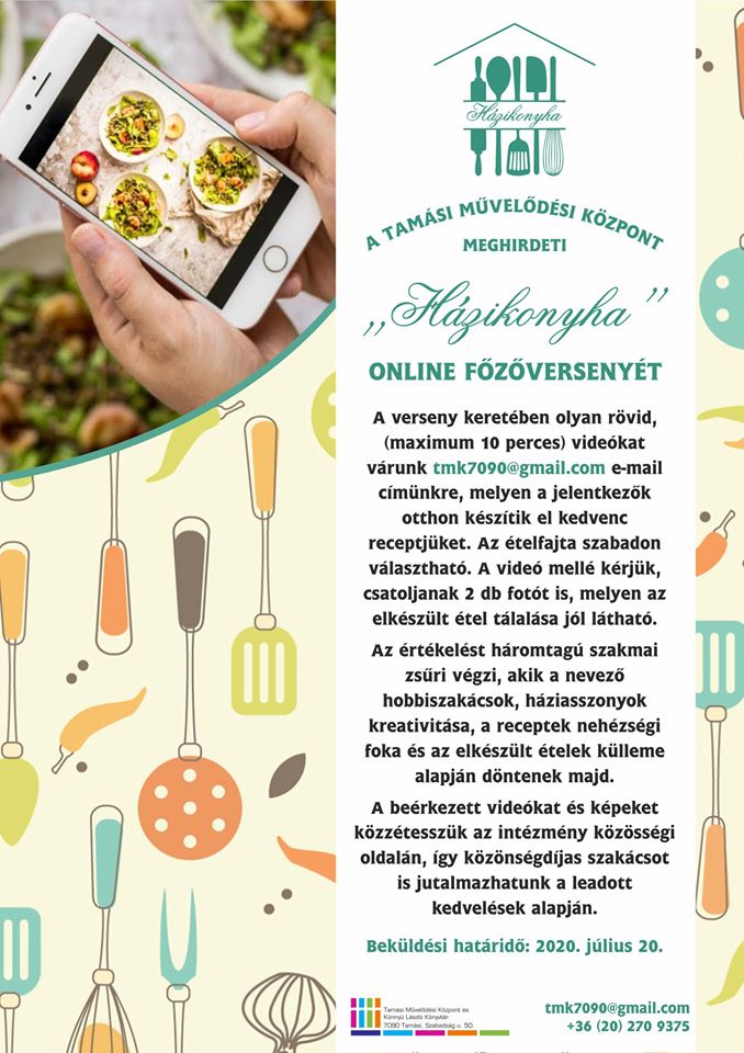 Ahogy azt már megszokhatták, a június-július mindig a főzőversenyek időszaka a város közösségének életében. Idén, immár 14. alkalommal került volna megrendezésre a Trófea Vadgasztronómiai Fesztivál és 20. alkalommal a „Tamási Bográcsmestere” főzőverseny. Mivel a megszokott módon nem tudják lebonyolítani ezeket a rendezvényeket, a művelődési központ munkatársai úgy gondolták, megrendezik „Házikonyha” nevű online főzőversenyüket, kicsit pótolva a közös főzés élményét. Ez a kezdeményezés lehetővé teszi, összerendezetten, csokorba szedve, sokakhoz elérve oszthassák meg egymással kedvenc receptjeiket, konyhai fortélyaikat a résztvevők.