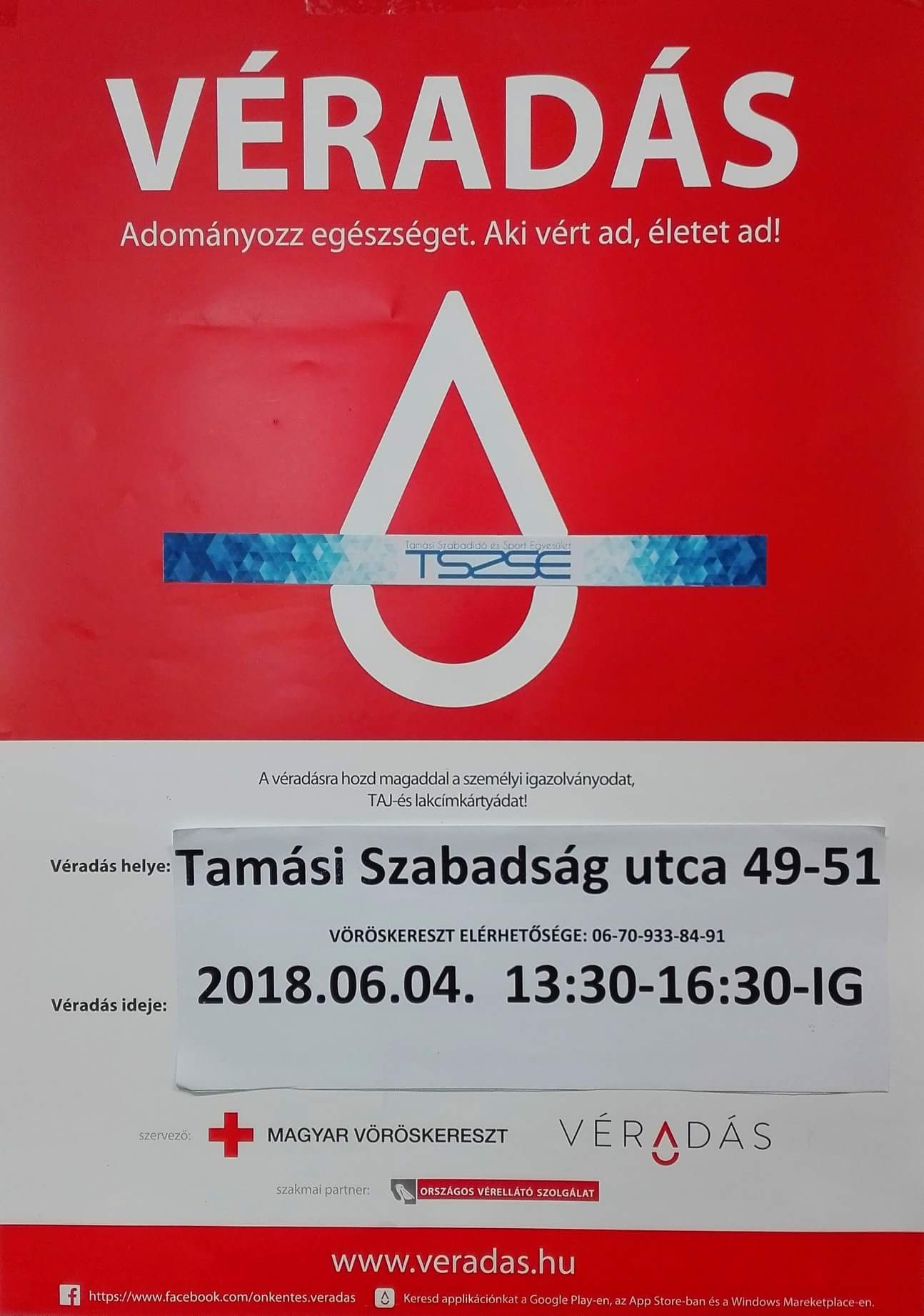 A Tamási Szabadidő és Sport Egyesület a Vöröskereszt tamási szervezetével karöltve véradást szervez ma délután. A TSZSE összes szakosztálya mozgósította tagjait, szurkolóit, szimpatizánsait, így remélik, hogy sokan látogatnak el ma 13:30-tól 16:30-ig a Vöröskereszt tamási telephelyére, a Szabadság úutca 49-51-es szám alá.