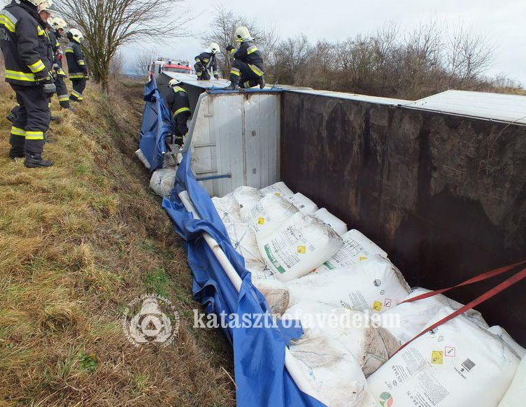 Ammónium-nitrátot szállított az a kamion, amelyik Nagykónyi és Koppányszántó között borult fel szerdán.