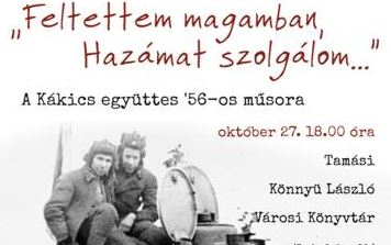 A Kákics együttes műsorával zárul az 1956-os forradalomra és szabadságharcra való megemlékezés Tamásiban, melyet október 27-én este 18 órakor tekinthetnek meg az érdeklődők a Könnyü László Városi Könyvtárban. A címe: Feltettem magamban, hazámat szolgálom, a műsor szakmai programjának megvalósítását 2016-ban a Magyar Művészeti Akadémia is támogatja. A Ferenc Jóska fújatja a trombitát... című első világháborús műsora után ugyanis ezt a történelmi témát dolgozta fel az együttes, idén ősszel debütált az '56-os összeállítás. Az 1956-os magyar forradalom előtt tisztelgő műsor dramaturgiájának kialakítása során olyan népdalok közül válogattak az alkotók, amelyek témái a történelmünkben korábban megélt szabadságharcok, a haza védelme és szeretete, valamint a kivándorlás. A műsor az ünnepi hangulatot a zenén, a népdalokon keresztül éri el. A népdalokat prózai részek, személyes visszaemlékezések sora gazdagítja, amelyek bemutatják a történelmi hátteret is.