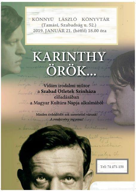 A tamási Könnyü László könyvtárban is megemlékeznek a magyar kultúra napjáról. Hétfőn este Karinthy örök címmel láthatnak az érdeklődők vidám irodalmi műsort a Szabad Ötletek Színházának előadásában 18 órai kezdettel.