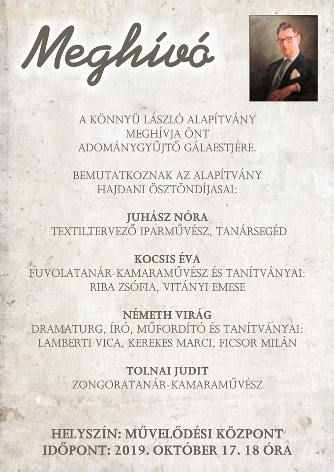 Az est szervezője a Könnyü László Alapítvány, este 18 órától bemutatkoznak az alapítvány hajdani ösztöndíjasai.