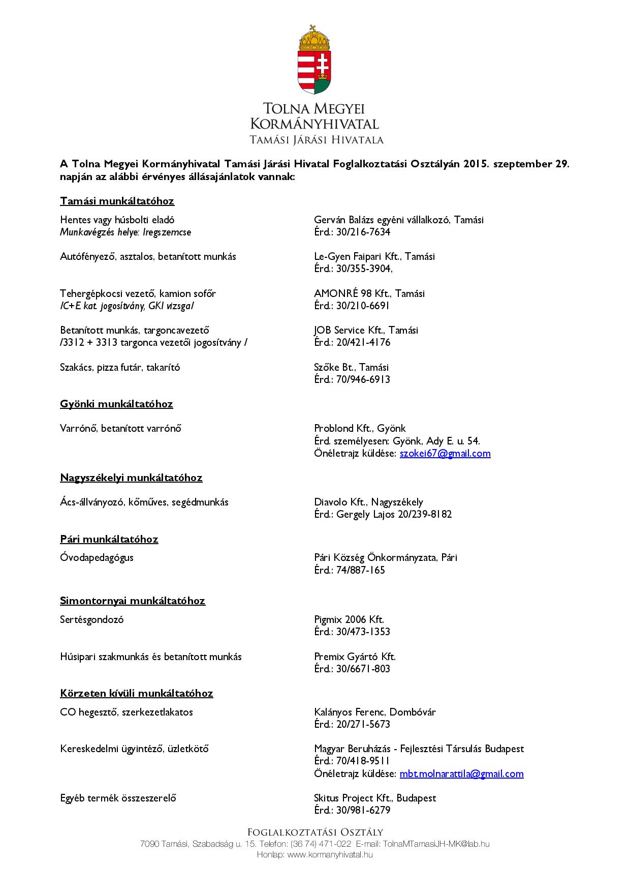 A Tolna Megyei Kormányhivatal Tamási Járási Hivatal Foglalkoztatási Osztályán jelenleg az alábbi érvényes állásajánlatok közül válogathatnak