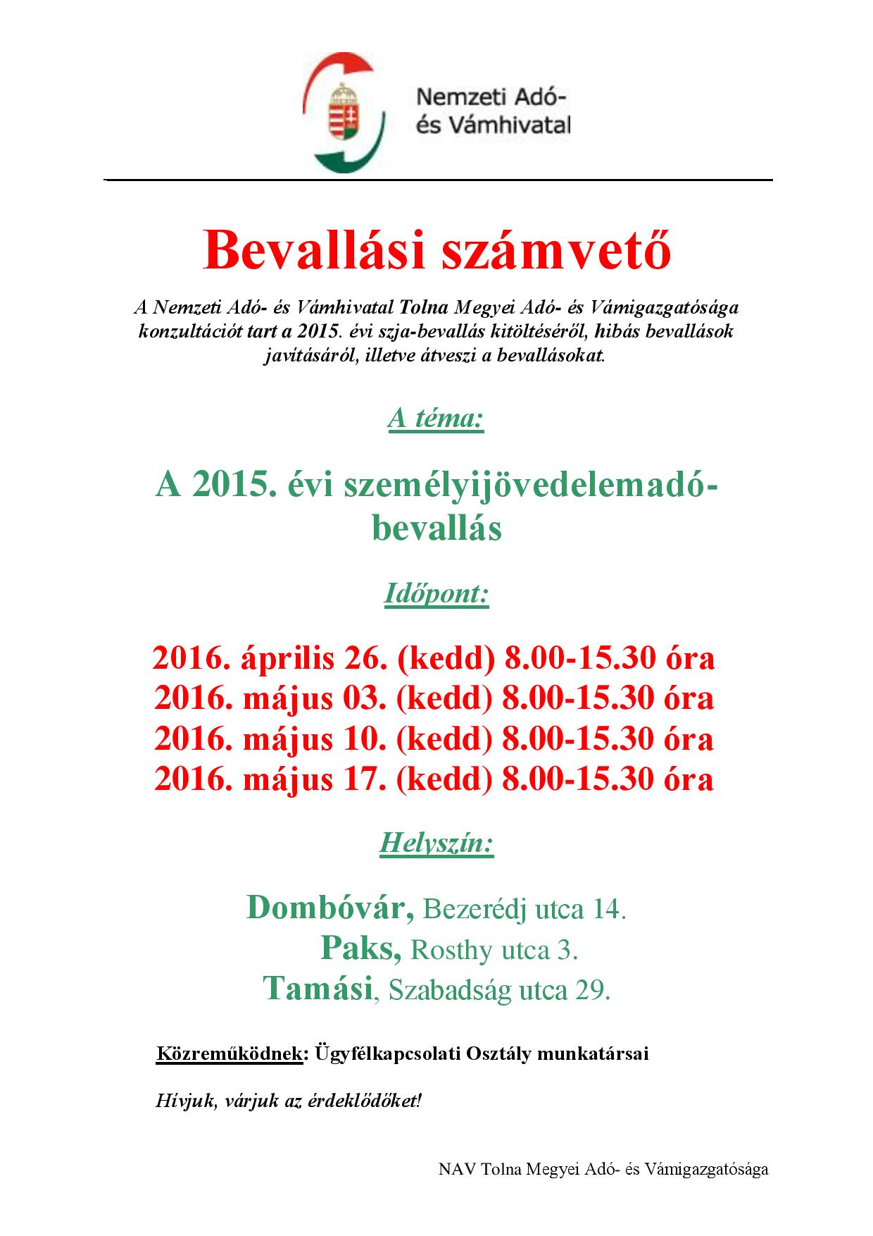 konzultációt tart a 2015. évi szja-bevallás kitöltéséről, hibás bevallások javításáról, illetve átveszi a bevallásokat Tamásiban is