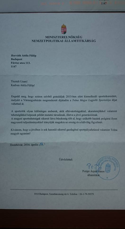 Potápi Árpád, nemzetpolitikáért felelős államtitkár gratulált levélben a tamási sportolónak