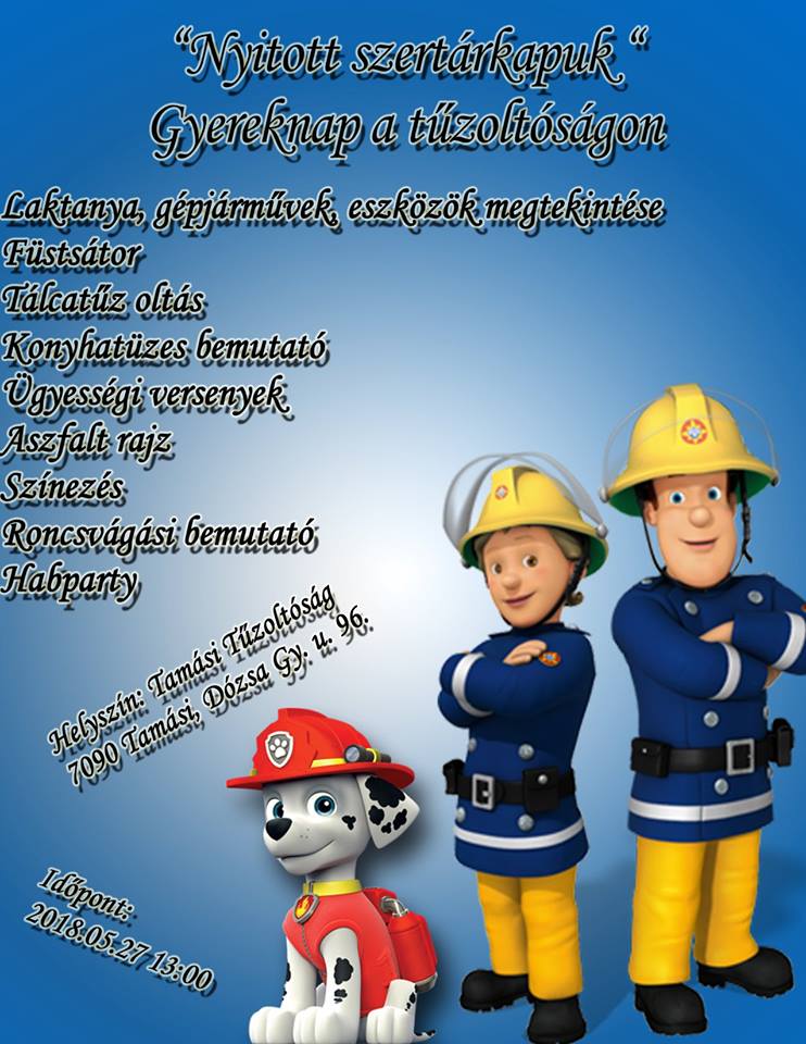 Gyereknapon, azaz május huszonhetedikén az ország csaknem négyszáz tűzoltólaktanyája várja a látogatókat. Országszerte délelőtt tíz és délután négy között fogadják a laktanyák a gyerekeket, családokat, az érdeklődők betekintést nyerhetnek a tűzoltók életébe. A katasztrófavédelem a nemzetközi gyermeknapon 2014 óta minden évben megtartja a Nyitott szertárkapuk elnevezésű rendezvényét. Az ország csaknem négyszáz tűzoltólaktanyája, vagyis az összes hivatásos tűzoltóság, katasztrófavédelmi őrs, önkormányzati tűzoltó-parancsnokság, illetve az önkéntes tűzoltó egyesületek többsége megnyitja kapuit ezen a napon a gyermekek előtt. A nyílt napon lehetőség van közelről megvizsgálni a tűzoltók által nap mint nap használt járműveket, különleges felszereléseket, kicsik és nagyok bejárhatják a laktanyát is, vagyis betekintést nyernek a tűzoltók életébe. Évről évre húsz-harmincezer látogató érdeklődik az ingyenes rendezvény iránt. A családokat, gyermekeket országszerte 10 és 16 óra között fogadják a laktanyák. A nap során a tűzoltók több próbariasztást is végrehajtanak. Tolna megyében tizenöt helyszínen várják az érdeklődőket, a hivatásos és önkormányzati tűzoltóságok mellett kilenc önkéntes tűzoltó egyesület is nyitott szertárkapukkal várja a családokat. A Tamási Önkormányzati Tűzoltóság is várja a látogatókat a Dózsa György utca 96-ban található laktanyájukba, füstsátorral, aszfaltrajzzal, roncsvágási bemutatóval, ügyességi versenyekkel, és az elmaradhatatlan habpartyval.