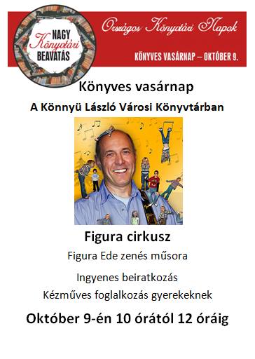 Az Országos Könyvtári Napok méltó zárásaként október 9-én rendezik meg a Könyves Vasárnapot, amikor ingyen iratkozhatnak be az érdeklődők, és ezen a napon a családoké, gyerekeké lesz a főszerep. Kézműves foglalkozásokon vehetnek részt és a már sokak által ismert Figura Ede vidám, interaktív, zenés gyerekműsorát is megtekinthetik a délelőtt folyamán.