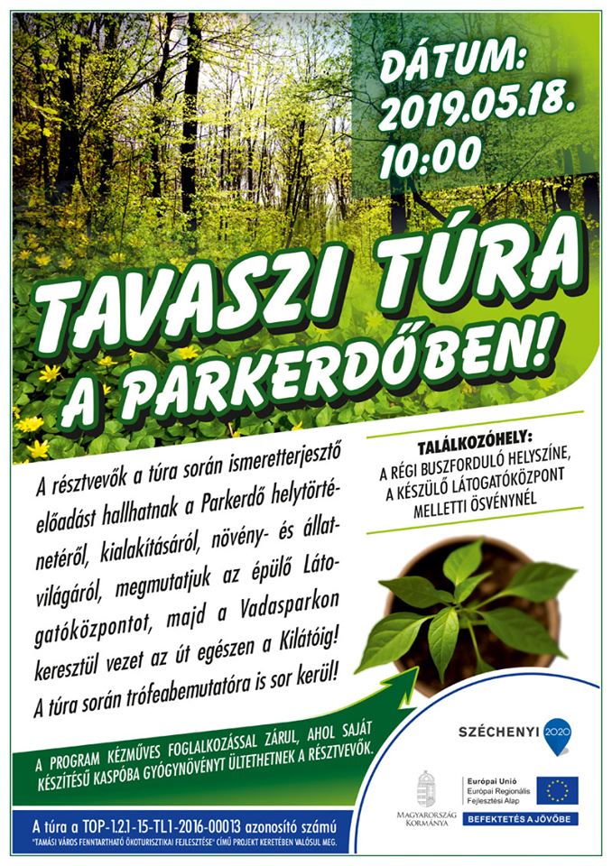 Az érdeklődők elsőként május 18-án tájékozódhatnak személyesen is a projektről – és több minden másról is. Aznap 10 órakor a régi buszforduló helyszínéről, az épülő látogatóközpont melletti ösvénytől Tavaszi túra indul, melyre a szervezők szeretettel várják a természet- s programkedvelőket. A túra keretében a résztvevők ismeretterjesztő előadást hallgathatnak a parkerdő történetéről, növény- és állatvilágáról, megtekinthetik a készülő látogatóközpontot, melyről személyesen Széles András alpolgármester fog tájékoztatót tartani, majd a vadasparkon keresztül elsétálhatnak egészen a kilátóig. A túra során trófeabemutatóra is sor kerül, végül pedig a program kézműves foglalkozással zárul, ahol aki akar, az kézműves kaspóba gyógynövényt ültethet.