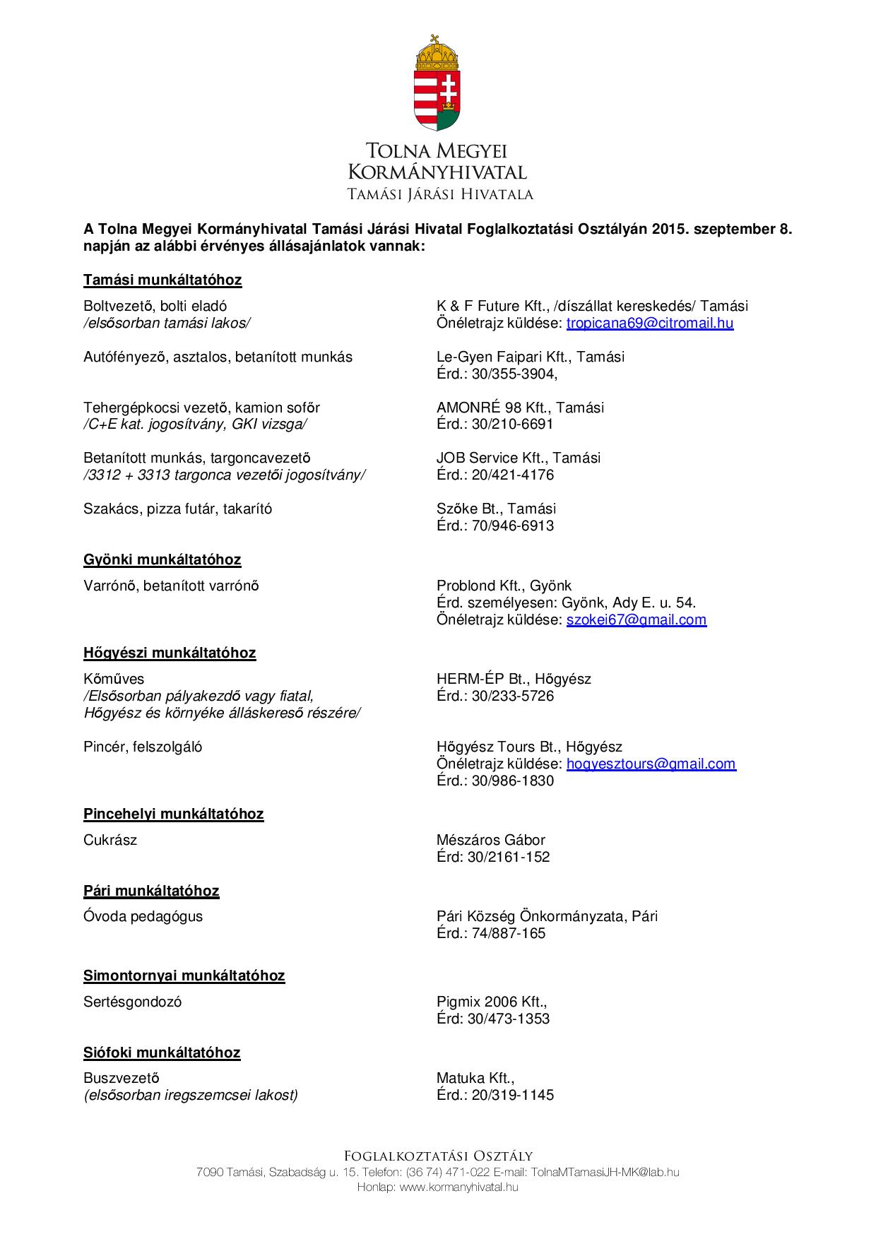 A Tolna Megyei Kormányhivatal Tamási Járási Hivatal Foglalkoztatási Osztályán 2015. szeptember 8-án az alábbi érvényes állásajánlatok közül válogathat