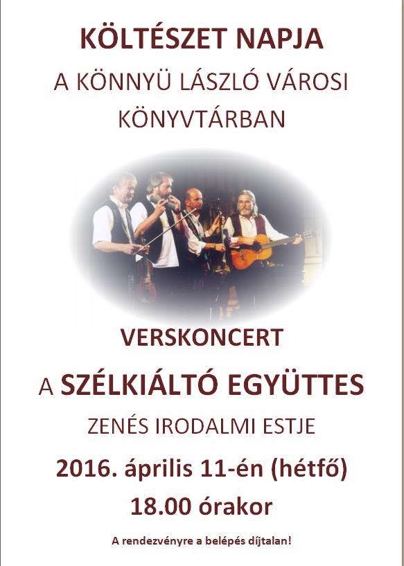 Este Verskoncert címmel a Szélkiáltó Együttes zenés irodalmi estjére várják az érdeklődőket a Könnyü László Városi Könyvtárban