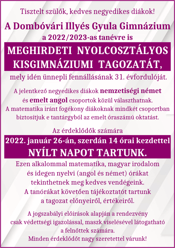 Meghirdeti nyolcosztályos kisgimnáziumi tagozatát a Dombóvári Illyés Gyula Gimnázium