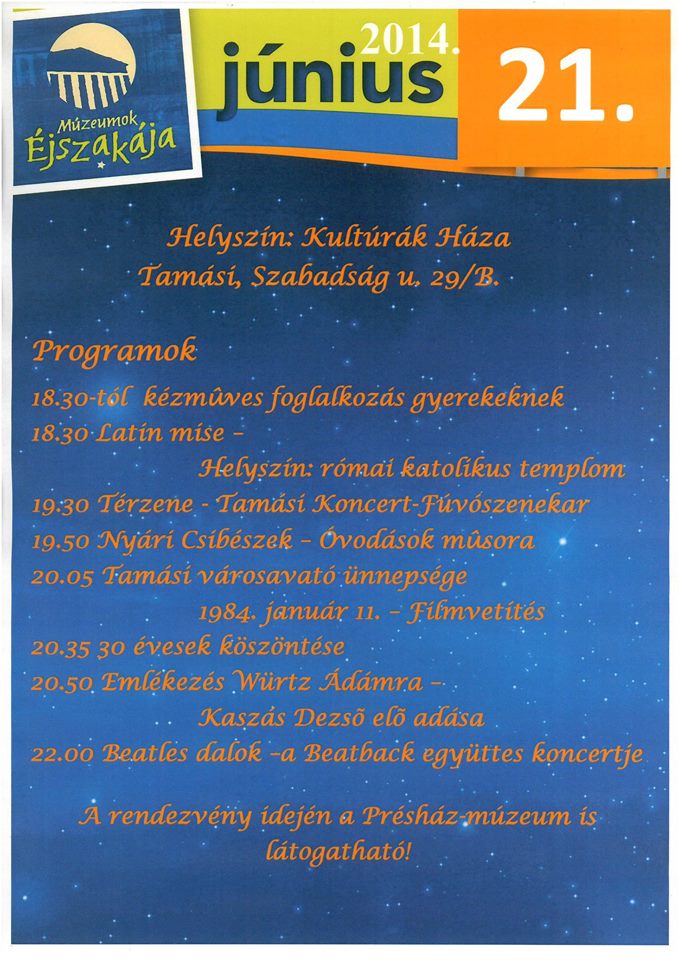 Június 21-én este és éjjel ismét megnyílnak a múzeumok kapui: a tamási Kultúrák Házában is színes programokkal várják az érdeklődőket