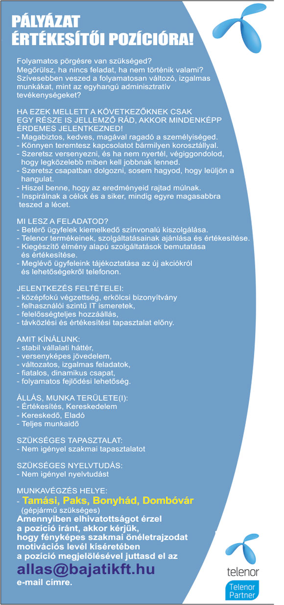 Jelentkezz Telenor értékesítőnek! Munkavégzés helye: Tamási, Bonyhád, Paks, Dombóvár
