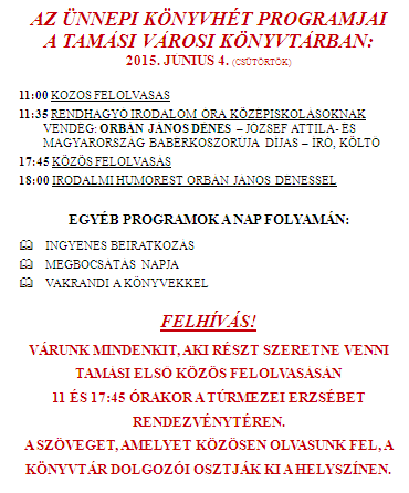 Az ünnepi könyvhét egyedülálló magyar kulturális rendezvénysorozat, évről évre töretlen sikerrel és népszerűséggel, immár nyolc évtizede. Egyre több település csatlakozik a programsorozathoz, köztük Tamási is, ahol a város első közös felolvasására invitálnak mindenkit.