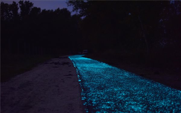 Hat különböző helyszín telepítik azt az anyagot, amely nappal képes magába szívni és tárolni a napfény által gerjesztett fényenergiát, majd azt éjszaka visszasugározni. Az útréteg negyedik, azaz kopórétegébe keverik a gyantába ágyazott szilikátszemcséket, és különböző sűrűséggel terítik szét, hengerelik az útfelületbe annak érdekében, hogy tesztelni lehessen, mekkora az a fényerő, amely kellemes, nem bántja a szemet.